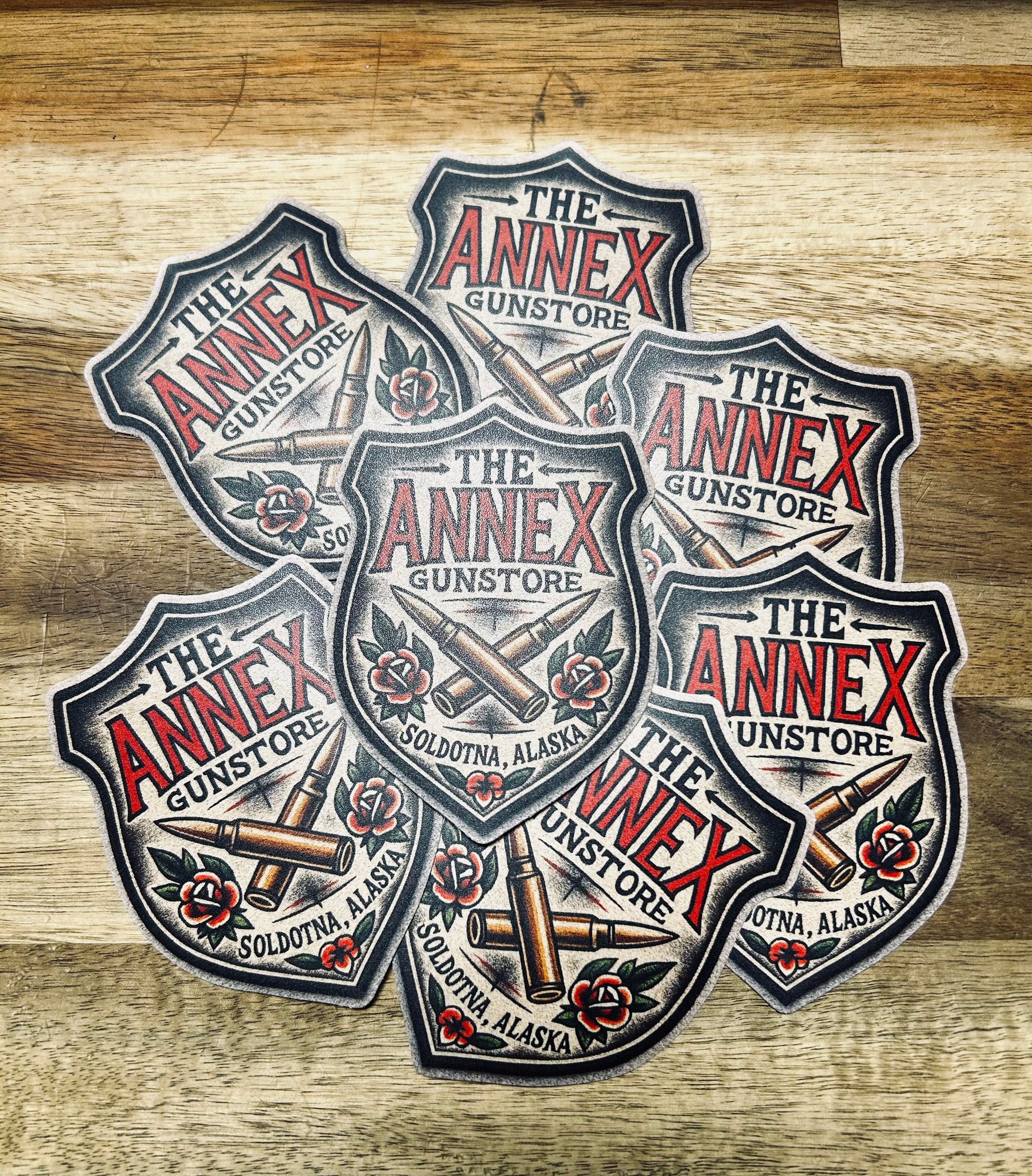 Represent where grit meets heritage. The Annex Gunstore Traditional Slap carries the same backbone and boldness as the shop itself — proudly bearing crossed rounds, classic tattoo-style roses, and our Soldotna, Alaska roots.